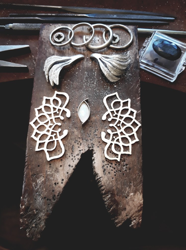 I use a range of materials: from precious metals (silver and gold) and gemstones (my favourites are labradorites, opals, moonstones and diamonds…) to more unconventional materials, such as beautiful or interesting found objects (in particular rocks, drift wood and shells).