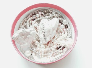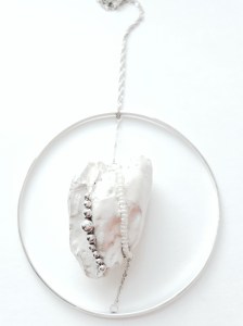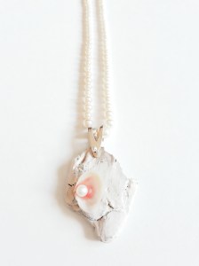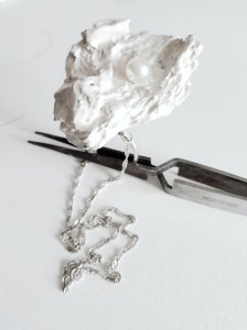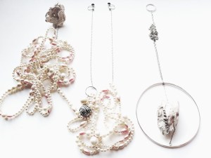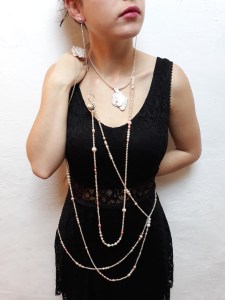 Here the jewellery is the physical expression of our own feelings. Each pearl represents a dream, a thought, a fear, regret, a fond memory, a wish… They are all around us and they are part of us. The use of non-precious organic materials seemed the perfect representations of those emotions which are at the same time shapeless, like pure air, and inextricably part of the body, we literally feel these emotions within us, weighing down (butterflies in the stomach, aching heart, flushed cheeks…).