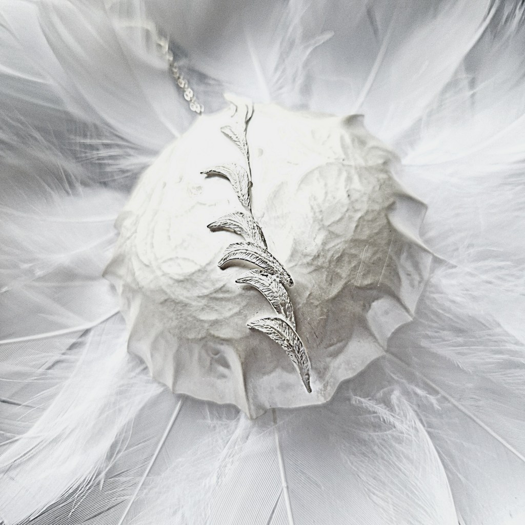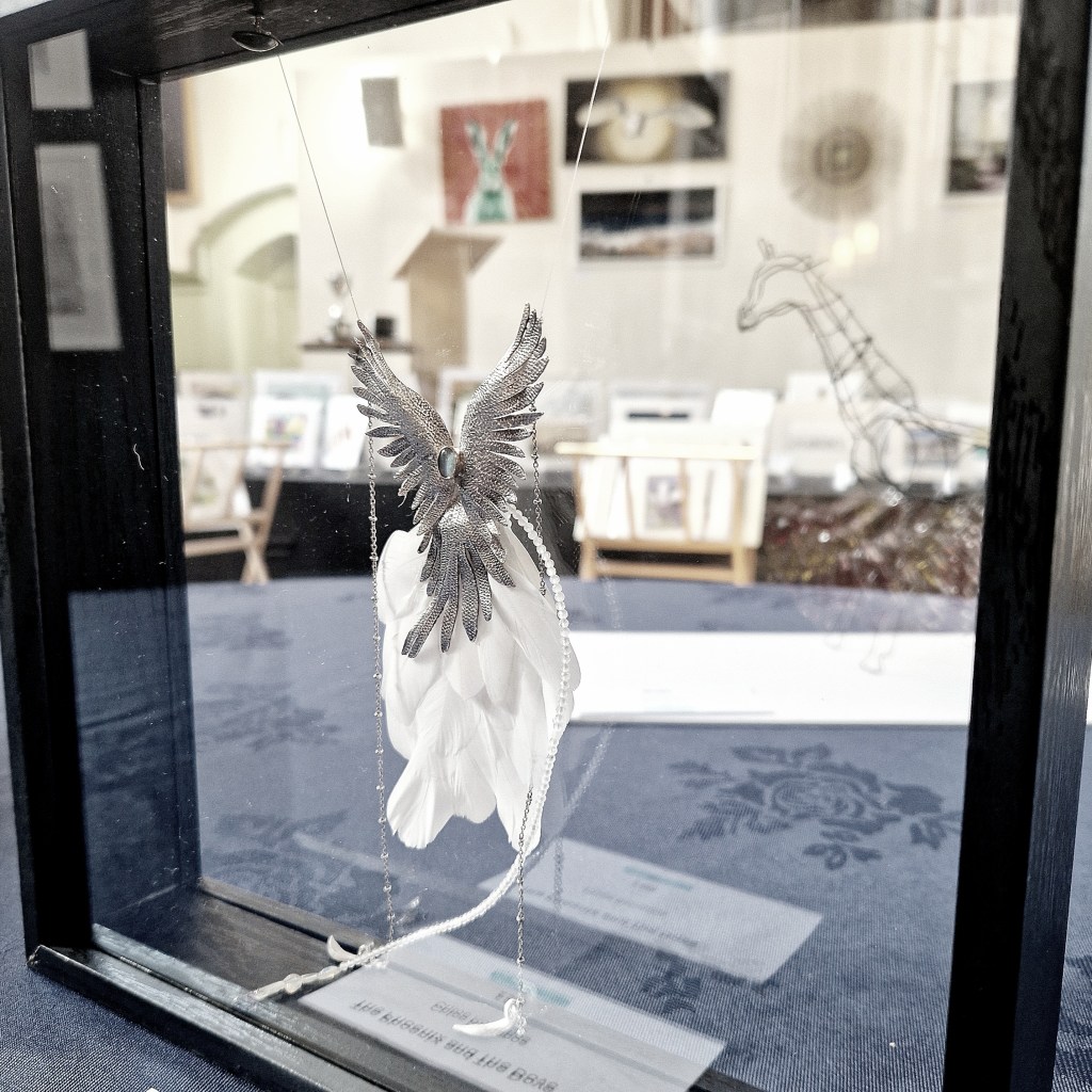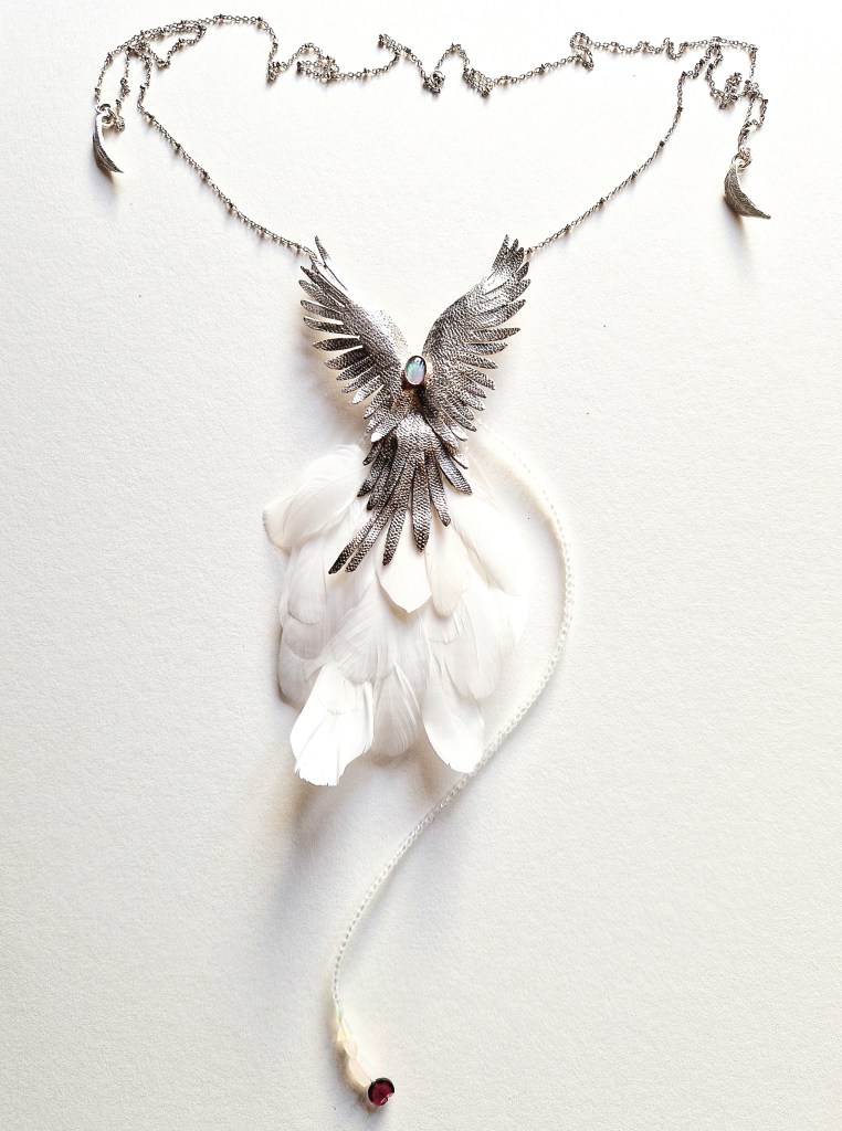 ‘The Phoenix-Dove’ is a two-sided necklace made in silver and gold with real dove feathers, and added gemstones. It stands as a strong message of peace and courage to rebuild.