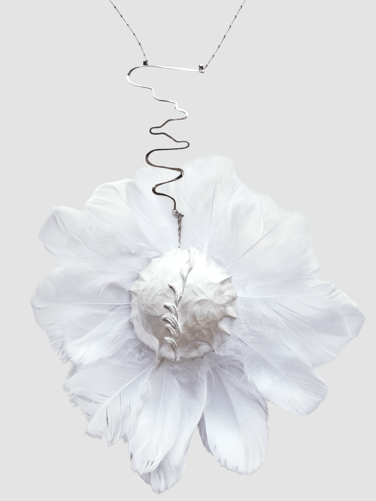 Using the body as a canvas, I like to expose feelings on the surface of the skin. I create large-scale jewellery using traditional silversmithing techniques, mixing precious materials and found objects, whether natural or man-made, to make visible what is invisible to the eye.