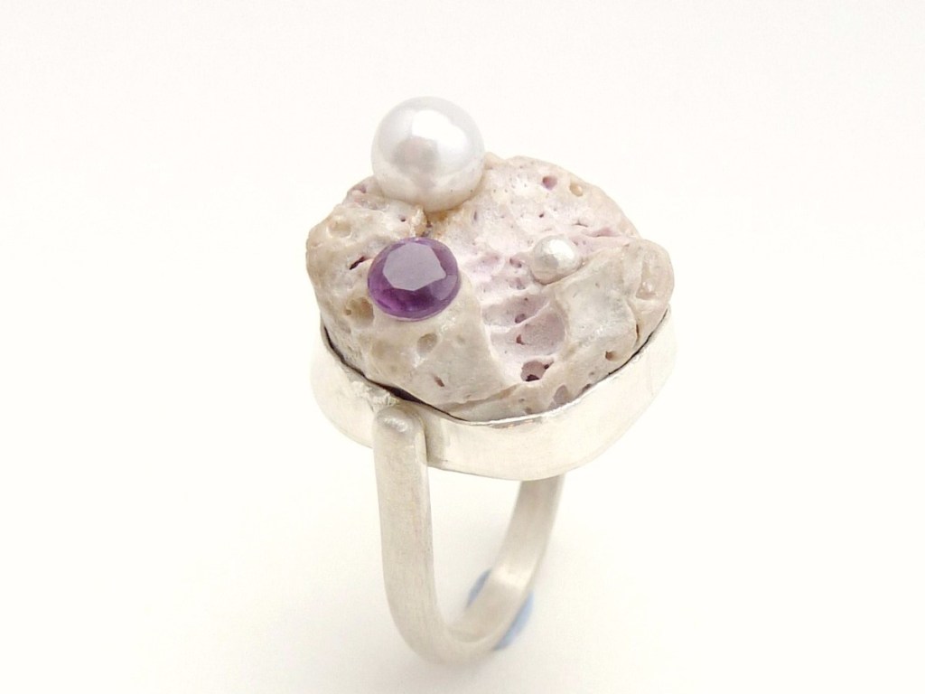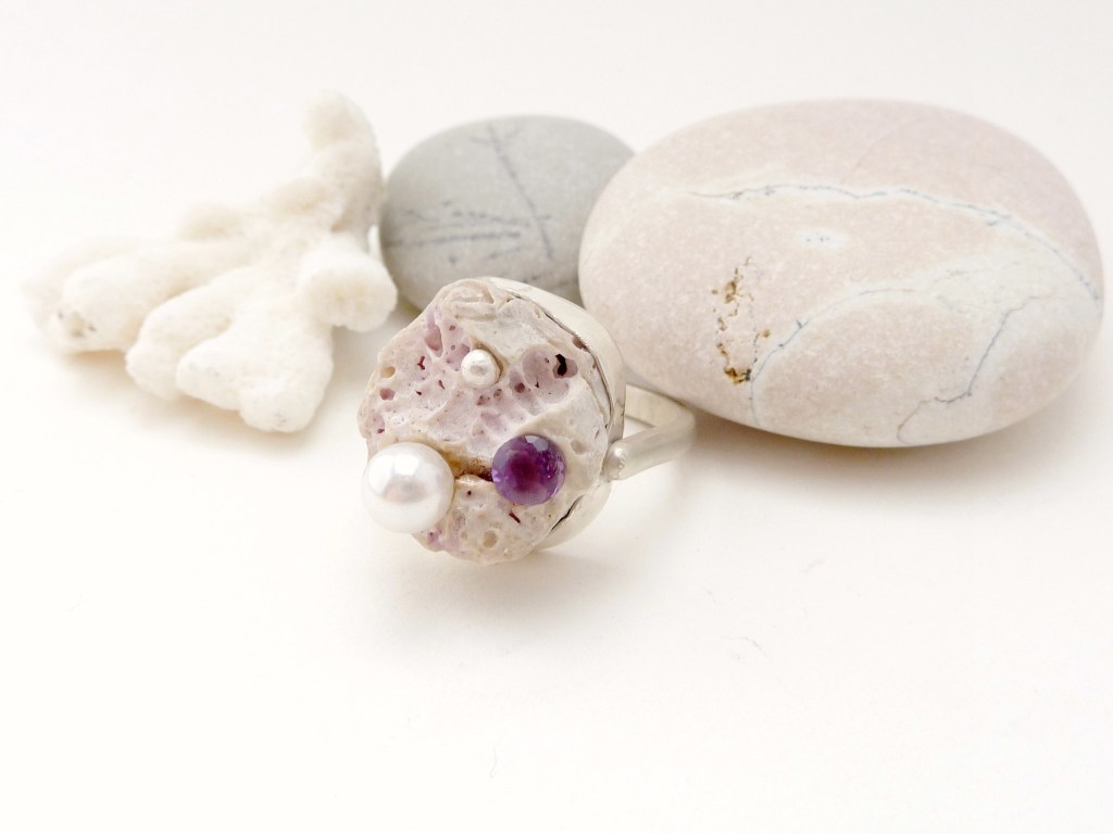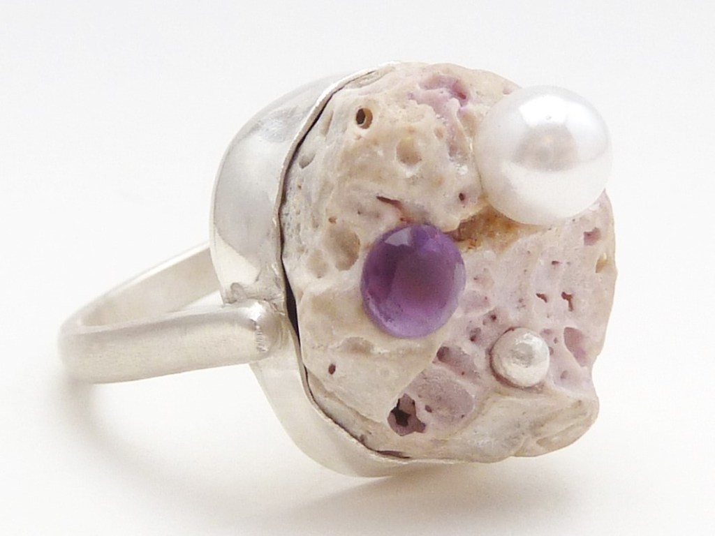 Bague ‘Petra Rose’. Argent, amethyste, perle et pierre rose.