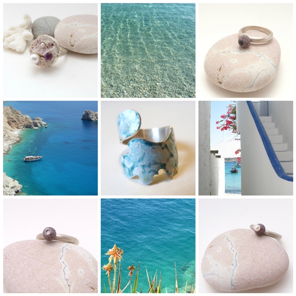The choice of materials used (like volcanic lava rocks reminiscent of the island of Santorini or unusual pebbles collected from Cycladic beaches, or rough cut stones adding intensity to the shape formed) are directly related to the emotions felt whist travelling (the vivid colours of India, the dream-like views of the rainforest, the dramatic architecture of Portugal). For me, preciousness is a feeling rather than an object, I like to use unconventional materials, as they are either a medium to express messages or they have acquired their own symbolic value.