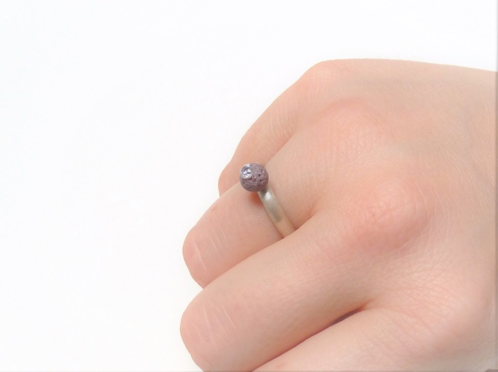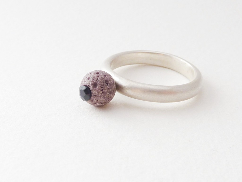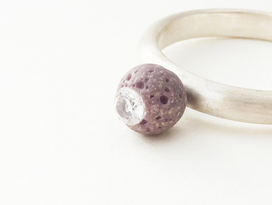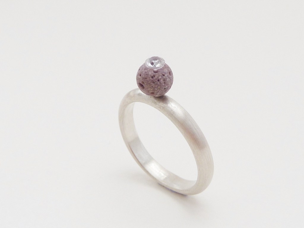 Bague ‘Thera’. Argent, perle de lave violette, zircon cubique