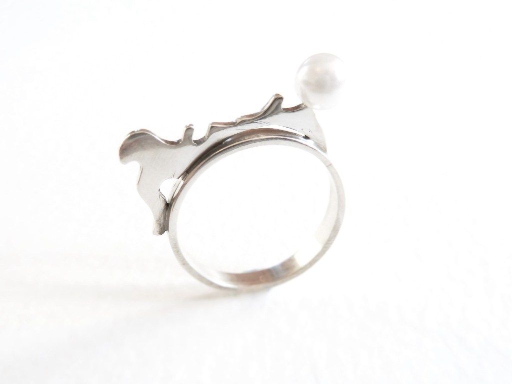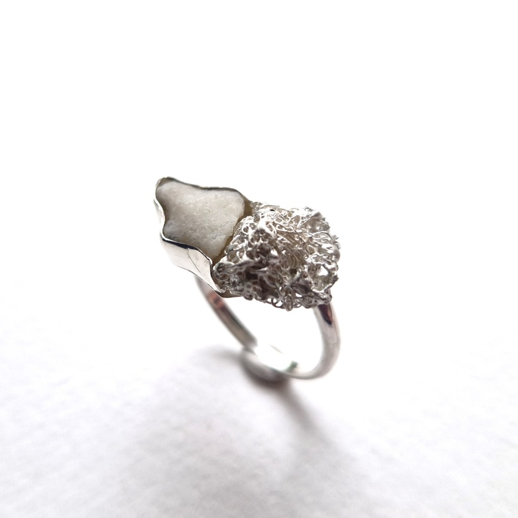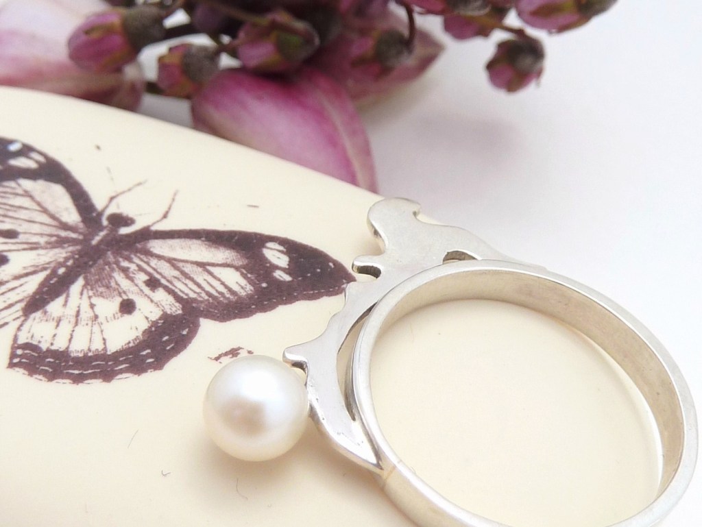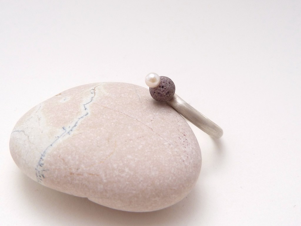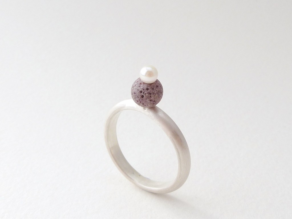 Bague ‘Thera’. Argent, perle nacre, pierre de lave violette.