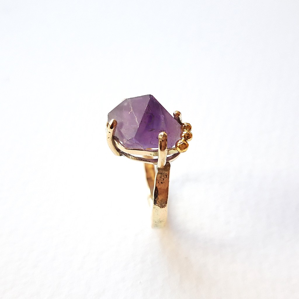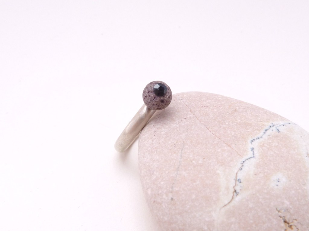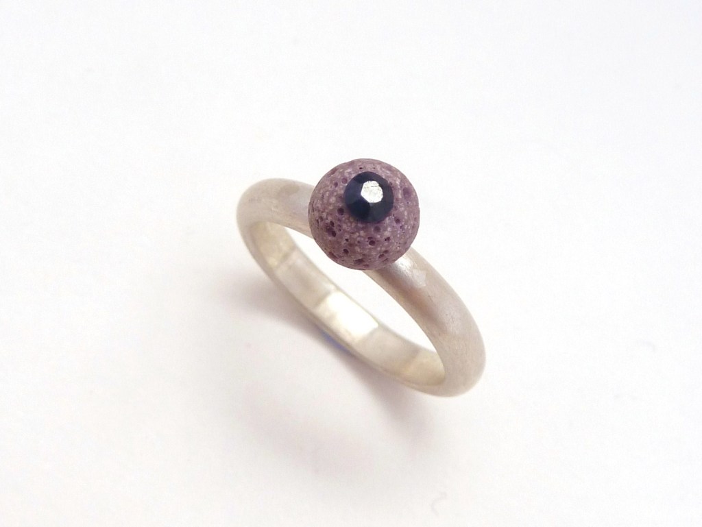 Bague ‘Thera’. Argent, perle de lave violette, saphir.