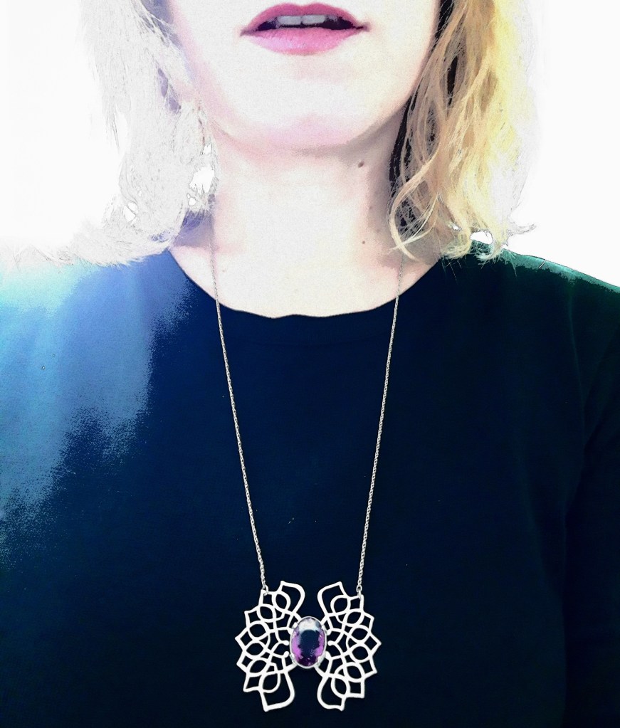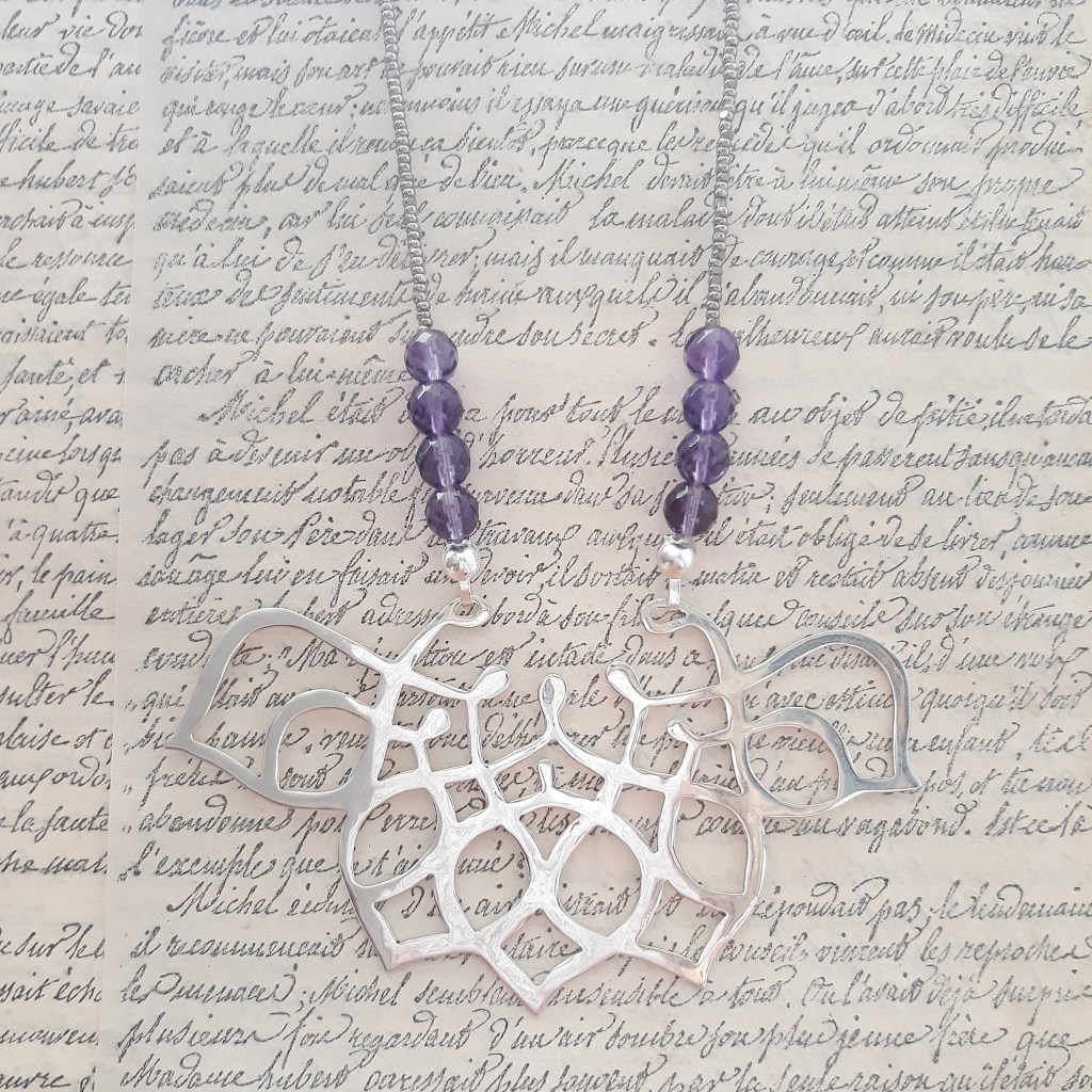 Collier ‘Mandala’. Argent, perles amethyste et perles metal.