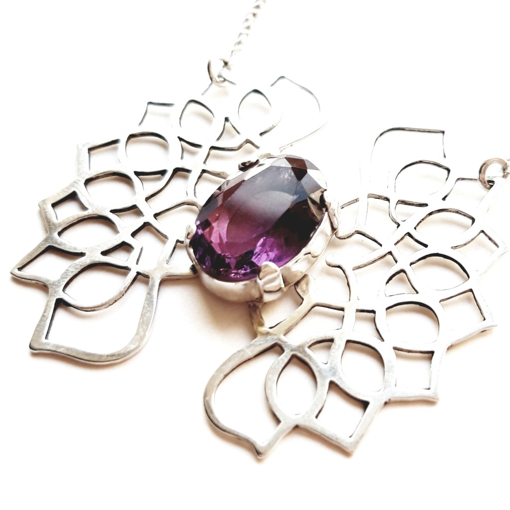Collier ‘Reve Indien’. Argent, fluorine violette avec une touche de vert