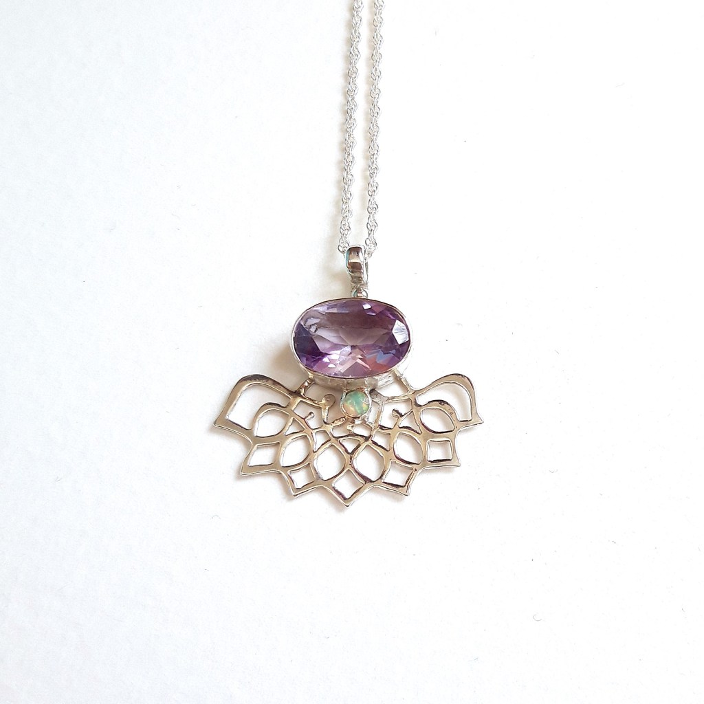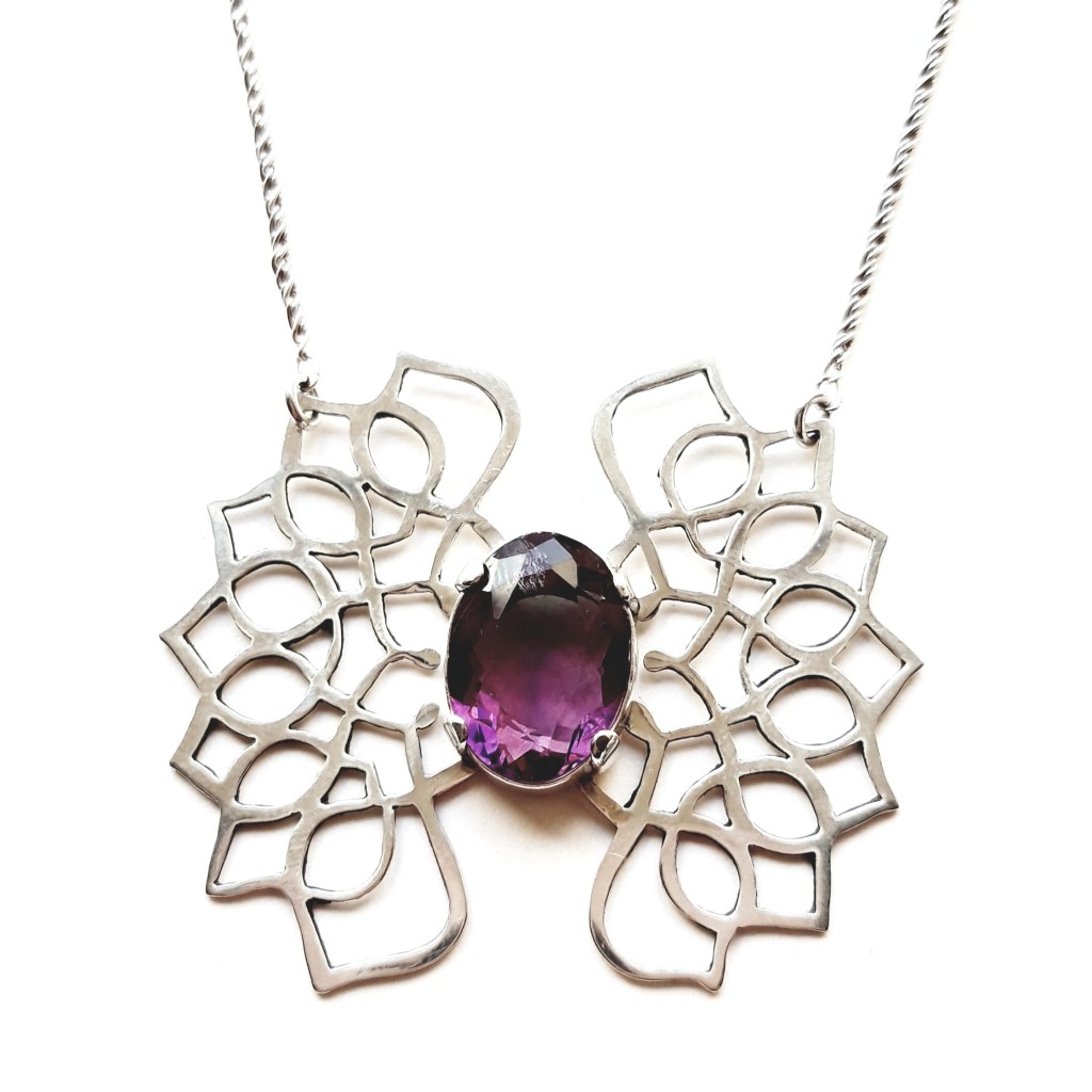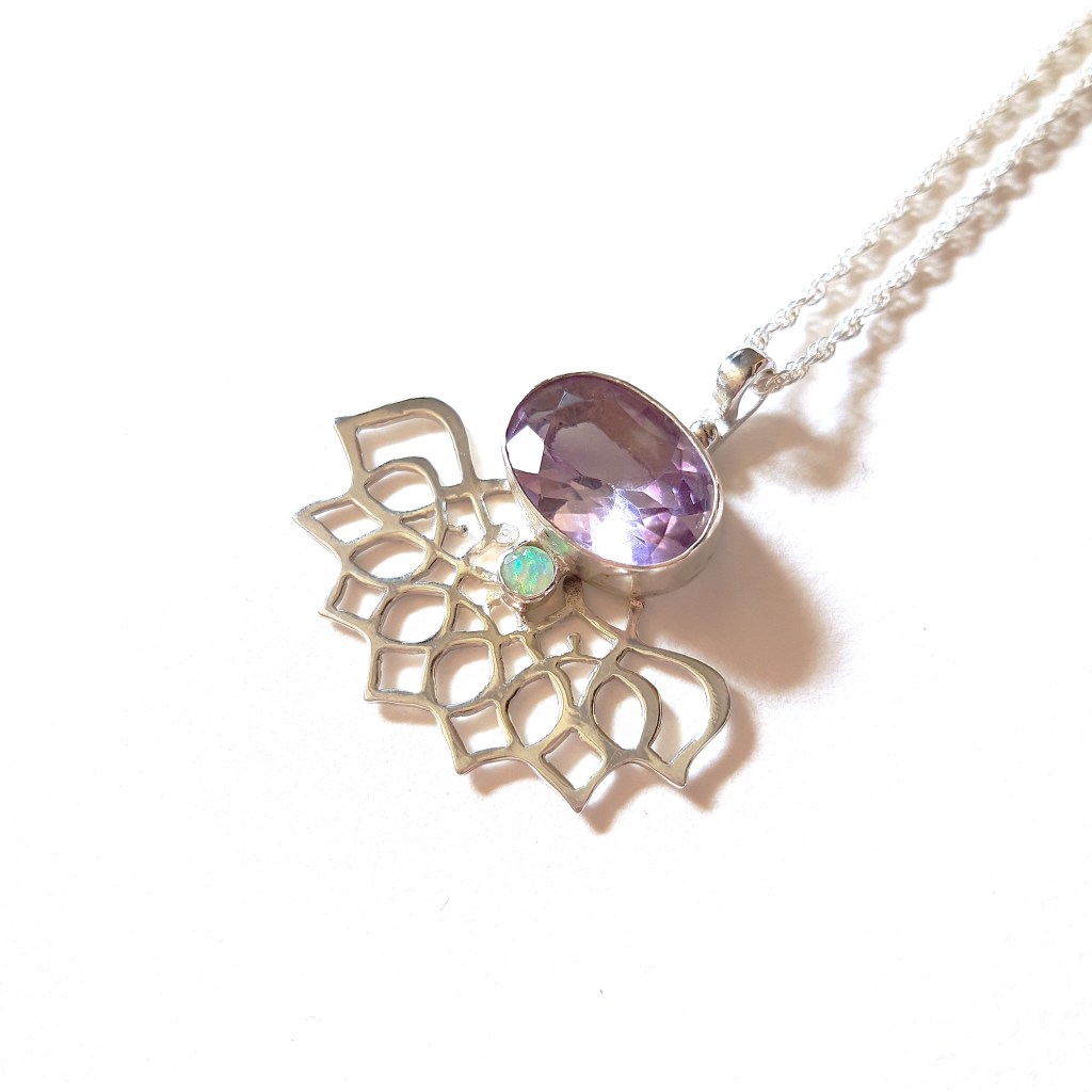 Collier ‘Mandala’. Argent, amethyste, opale.