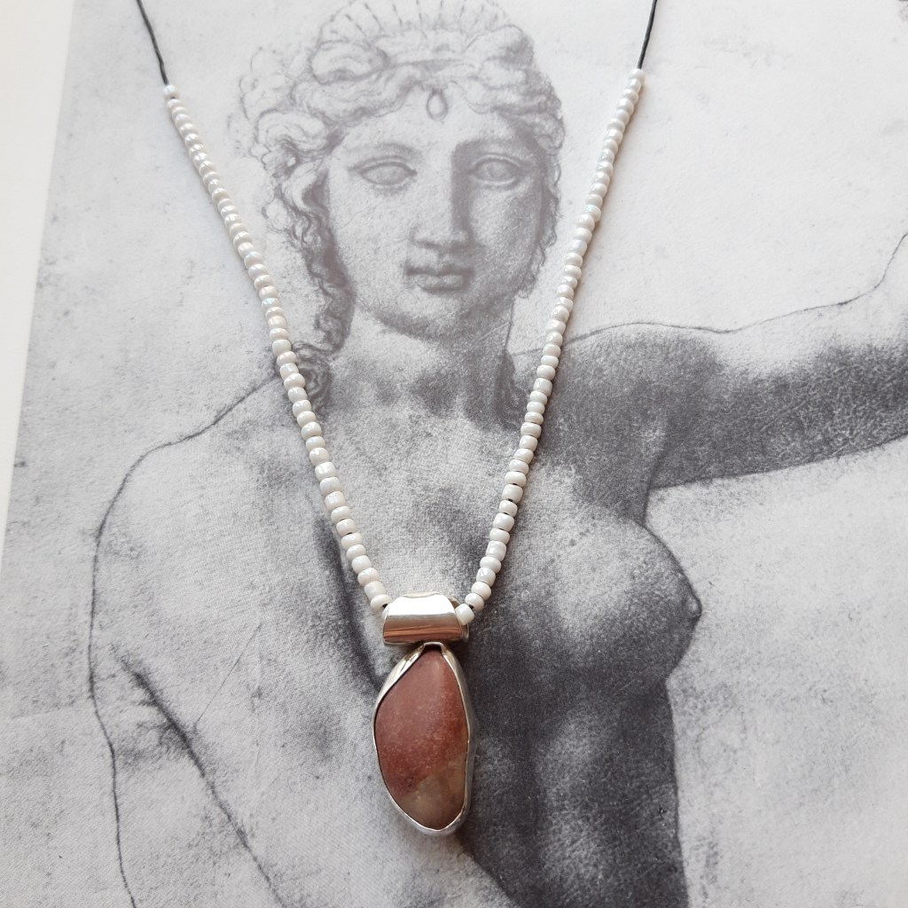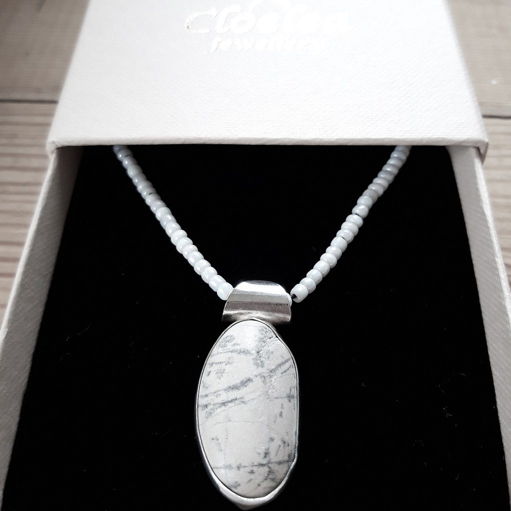 Sterling silver, white beads, leather cord, white and grey found rock from Greece.