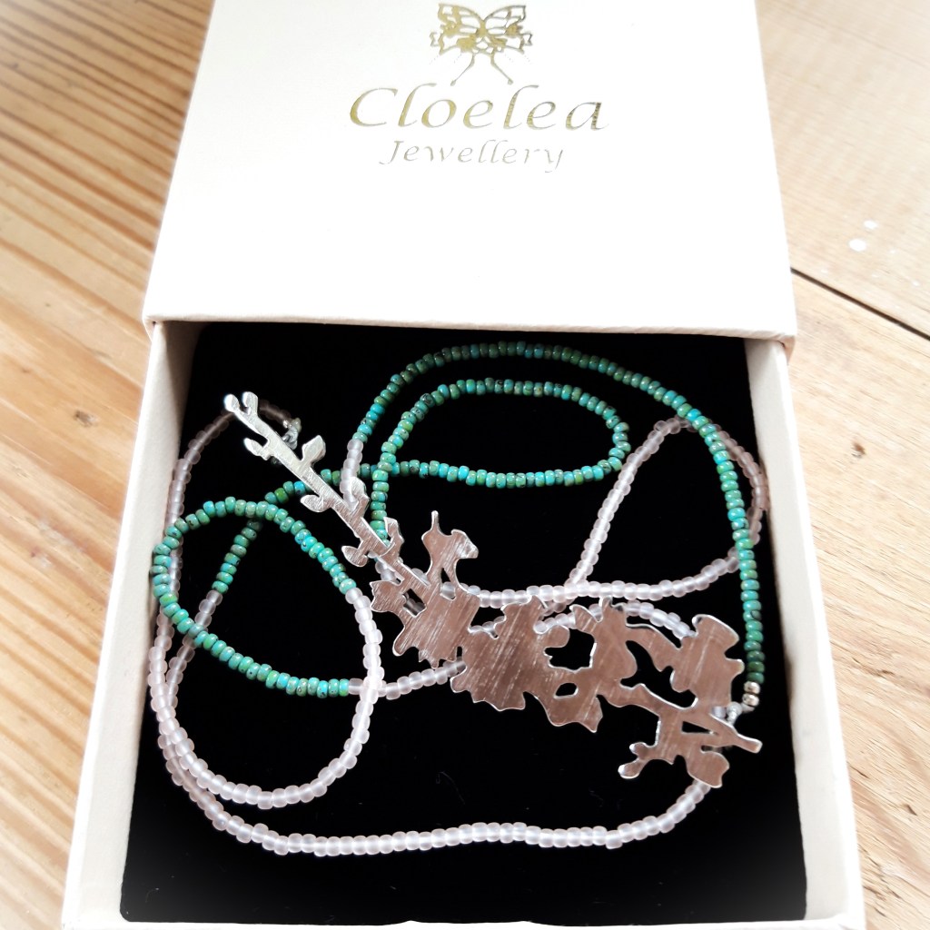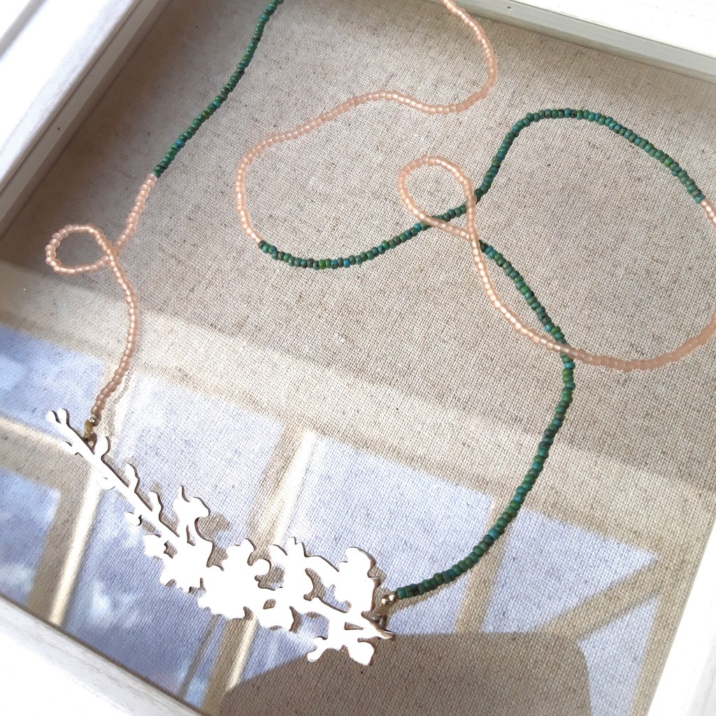 Collier ‘Fleur de Pecher’. Argent, perles roses et vertes.