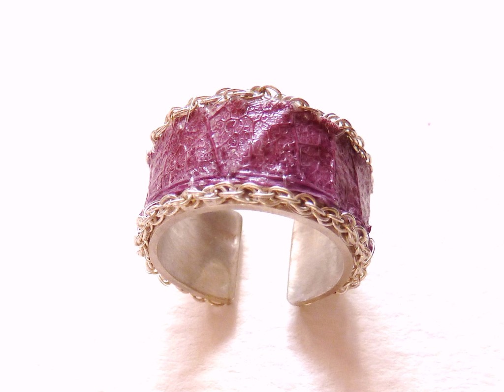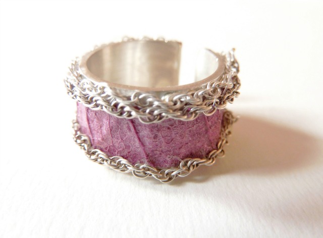 Bague ‘Free Me’. Argent, Papier feuille rose, chaine argent.