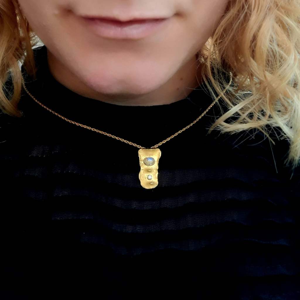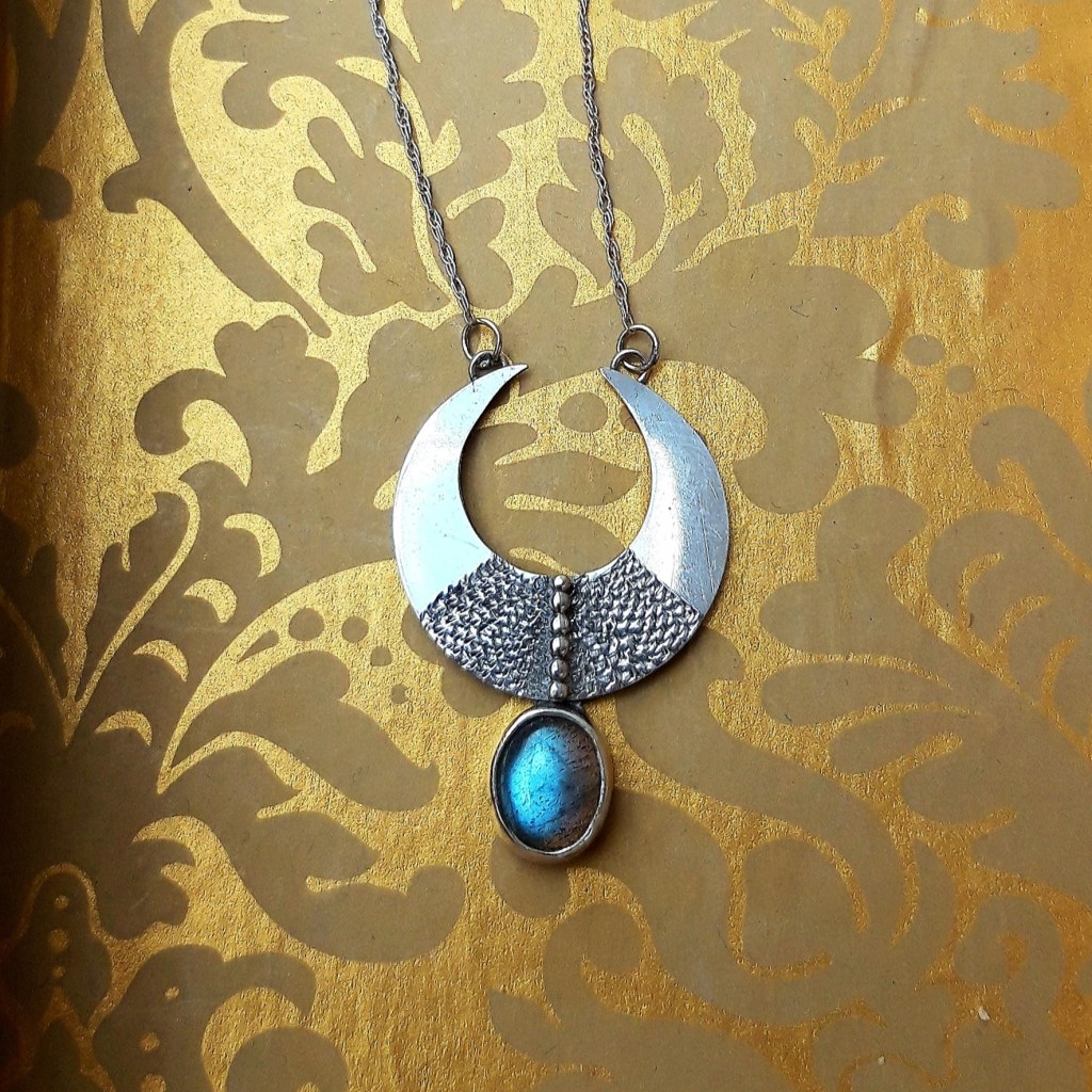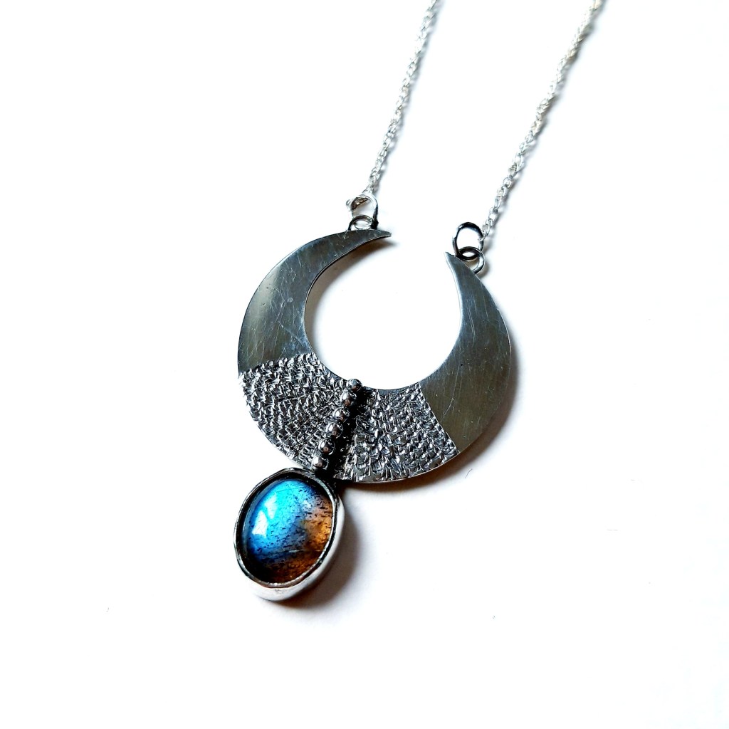 Collier ‘Mycenienne’. Argent, or, labradorite, grenat.