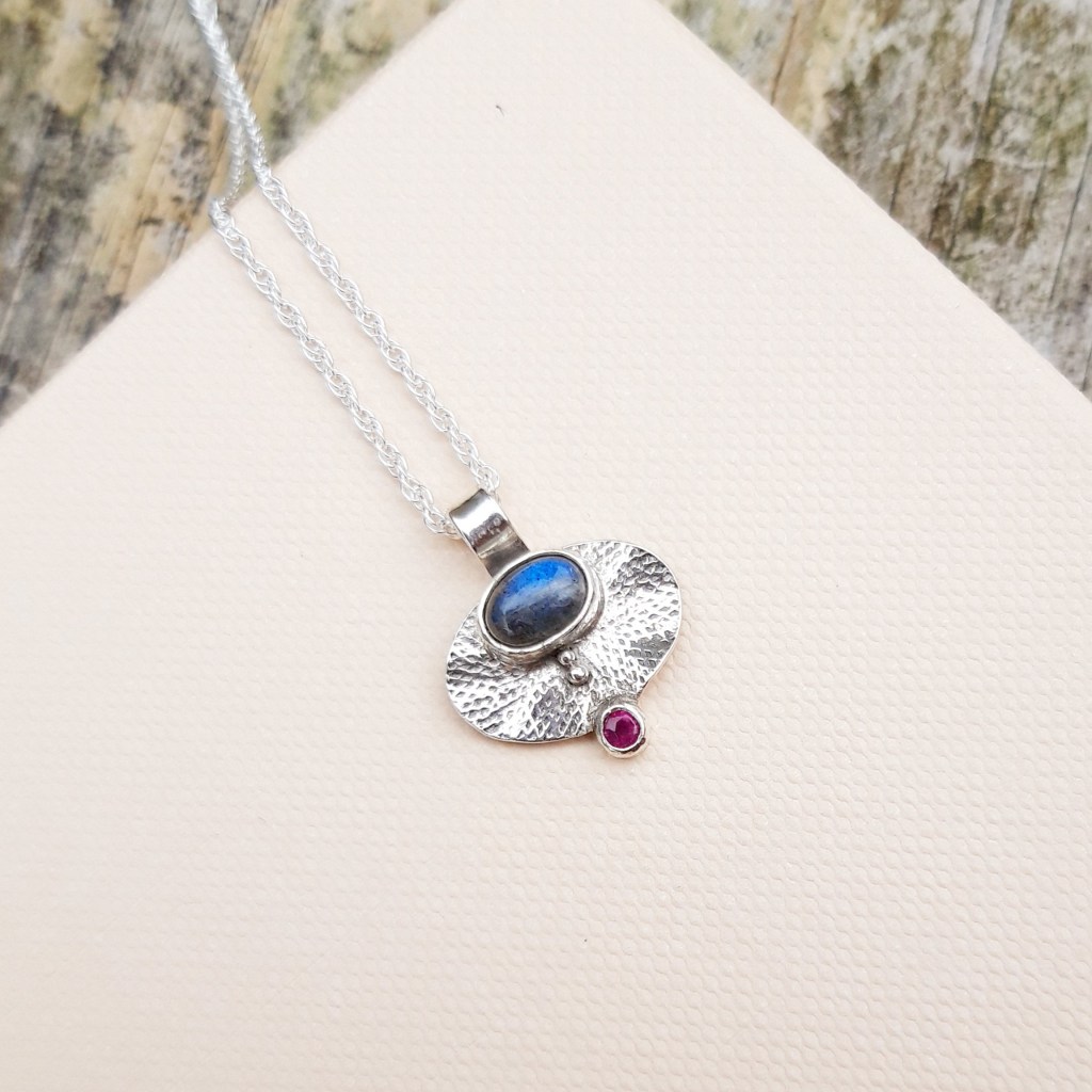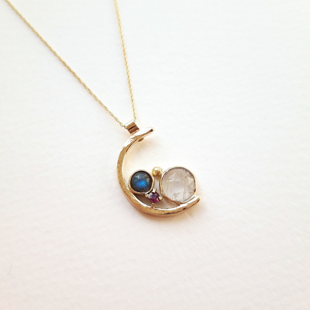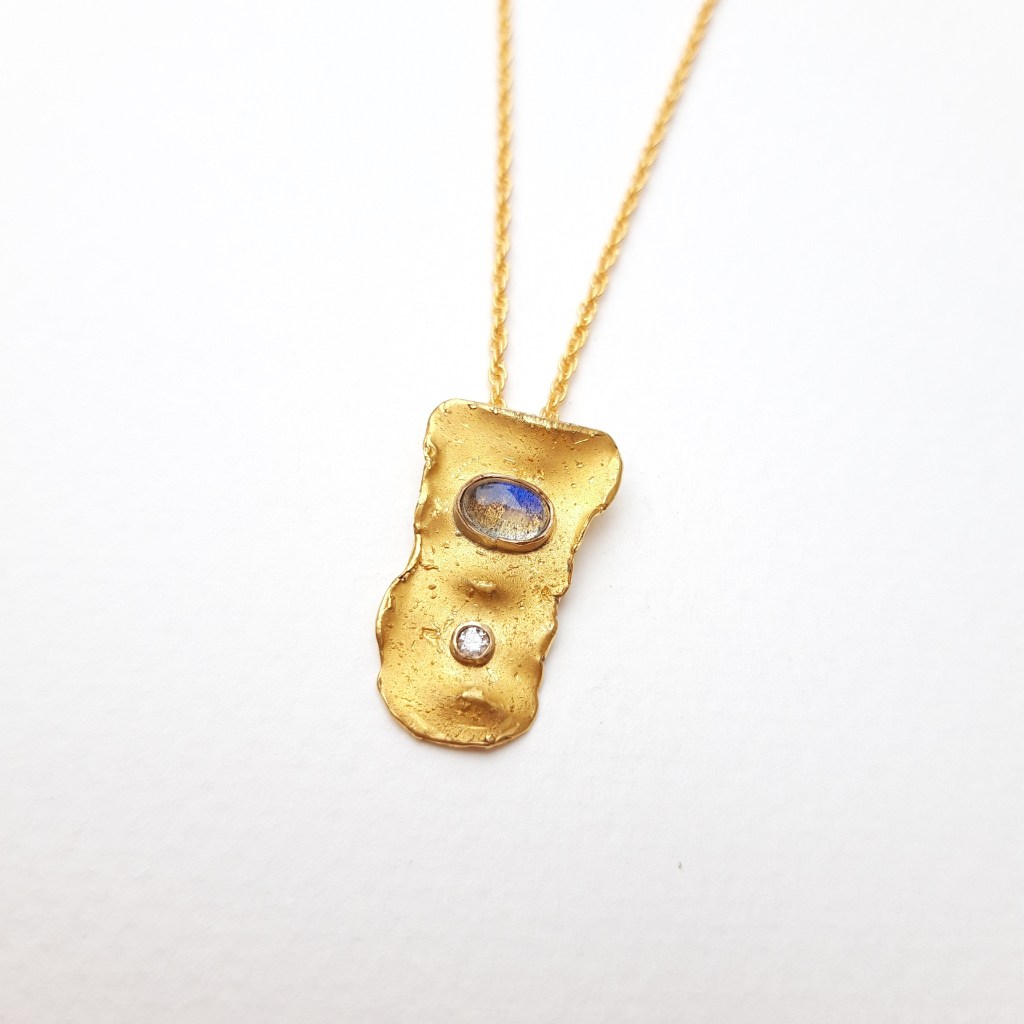 Collier ‘Mycenienne’. Argent, or, labradorite, grenat.