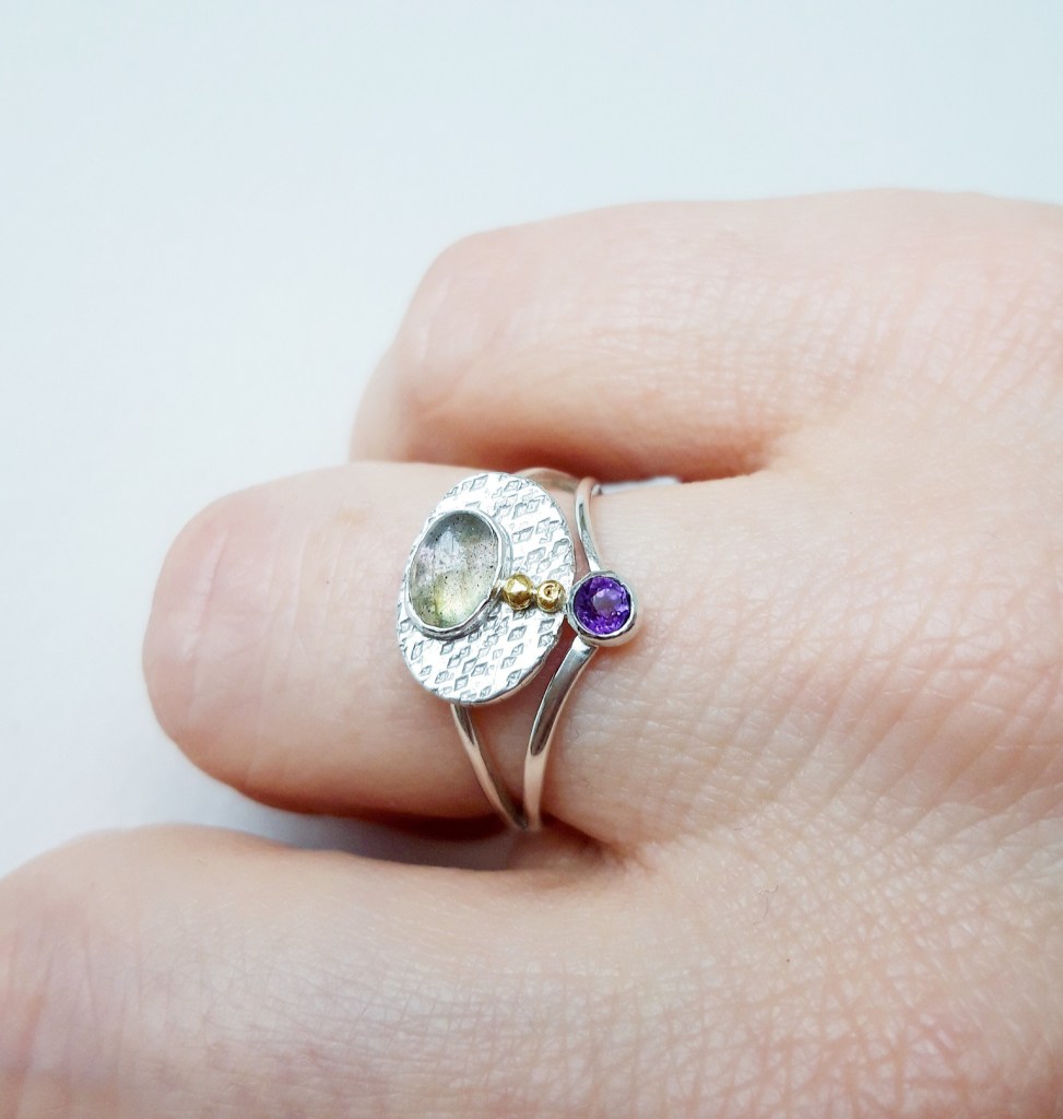 Bague ‘Mycenienne’. Argent, amethyste et labradorite.