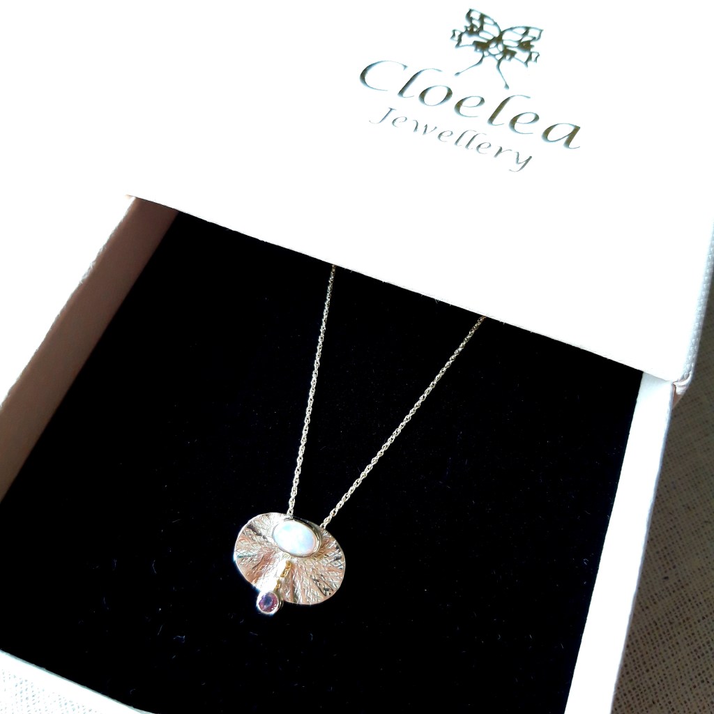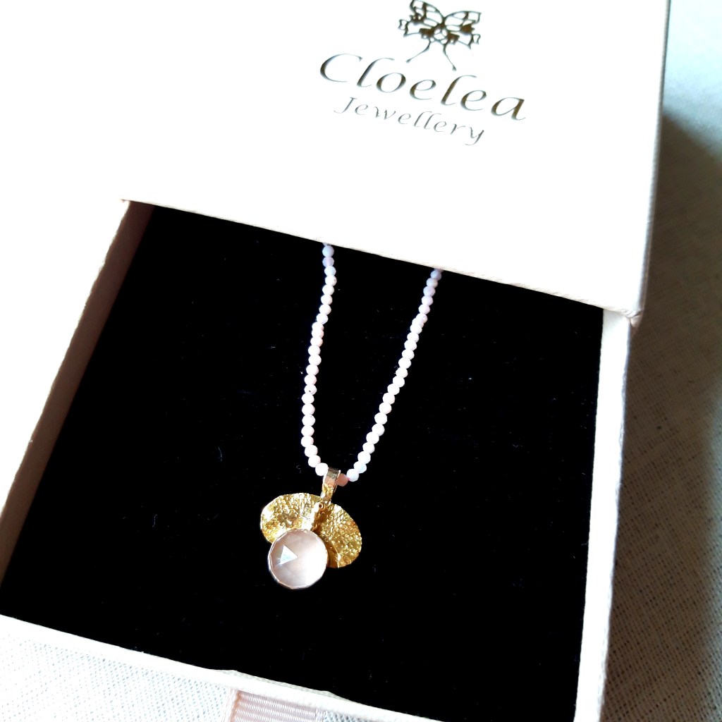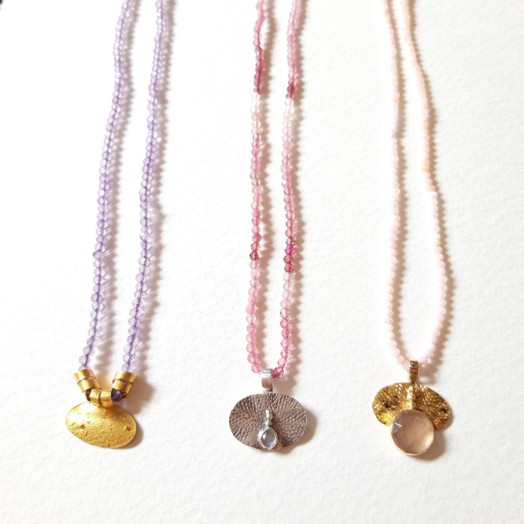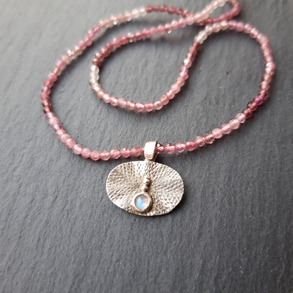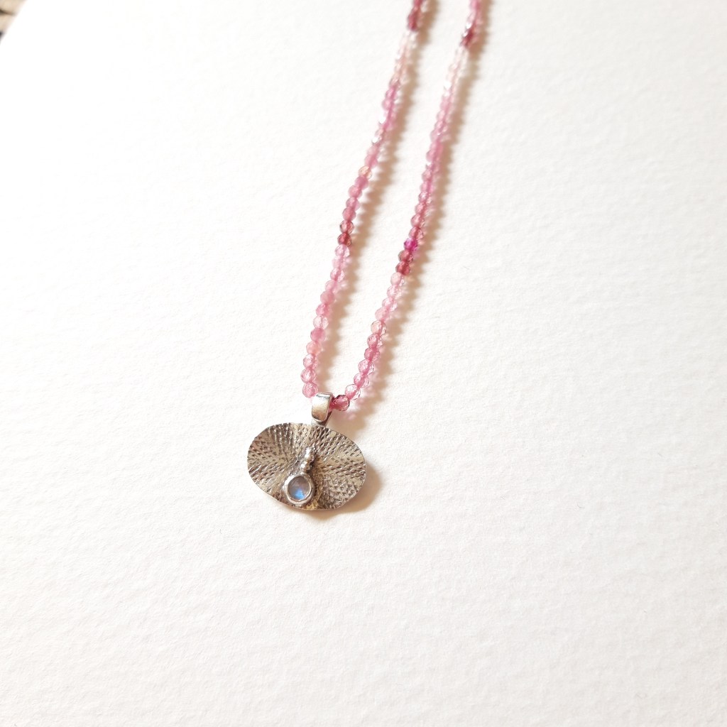Collier’ Mycenienne’. Argent Pierre de lune et perles roses de tourmaline.