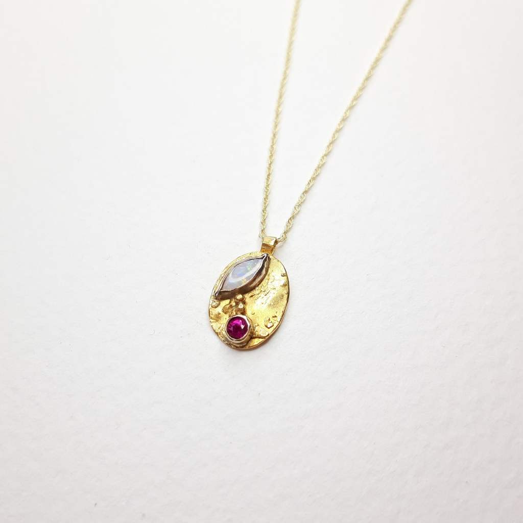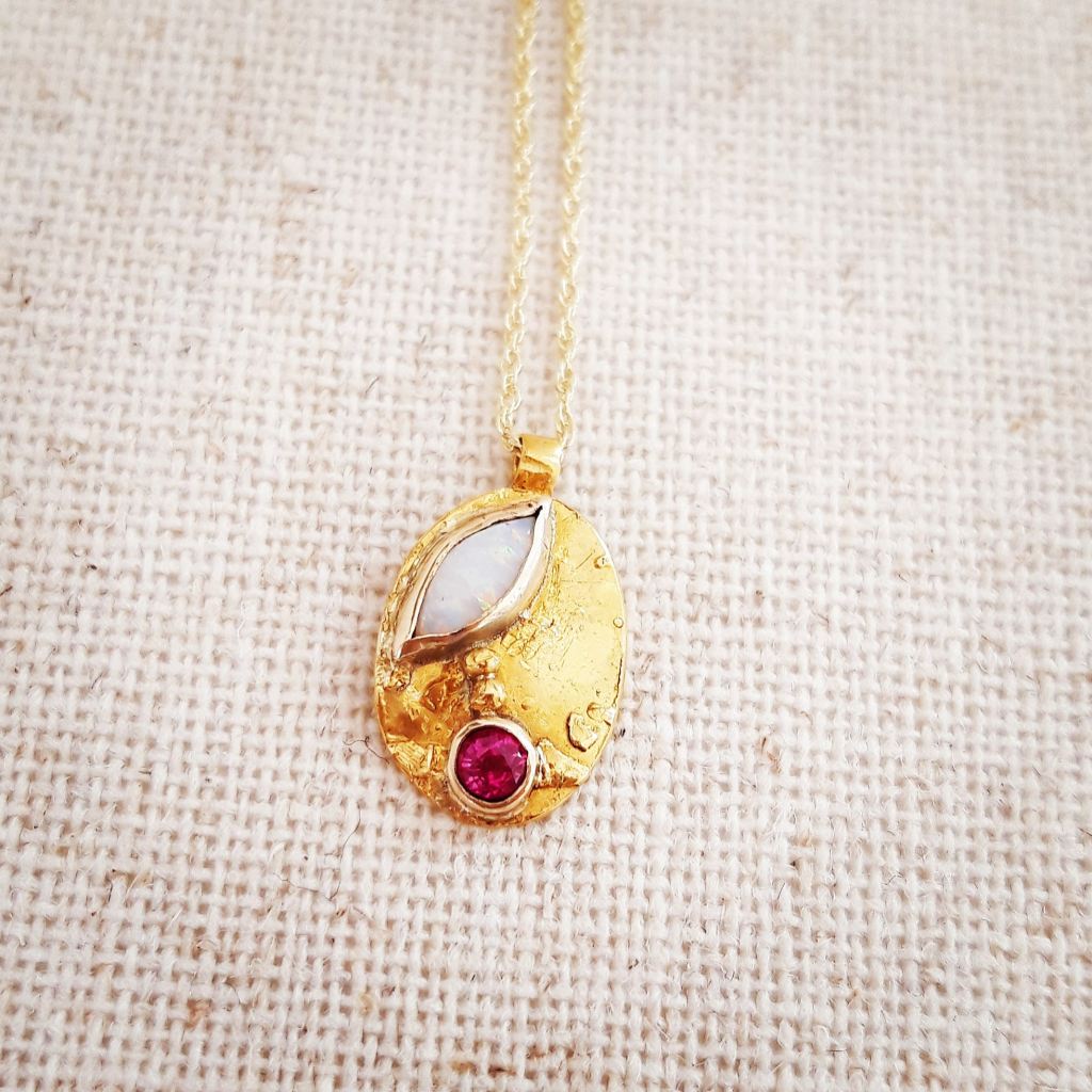 Collier ‘Mycenienne’. Or 24 ct, ruby, opale.