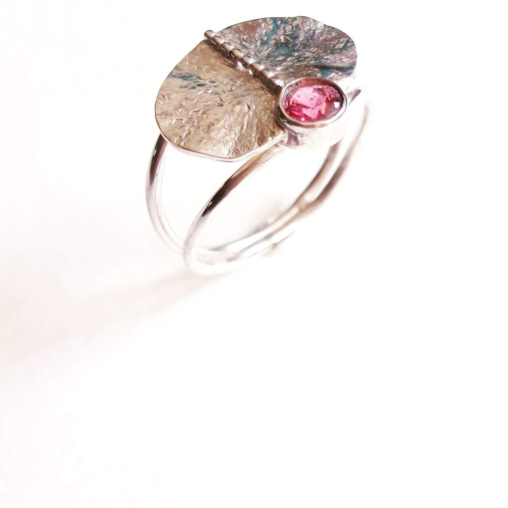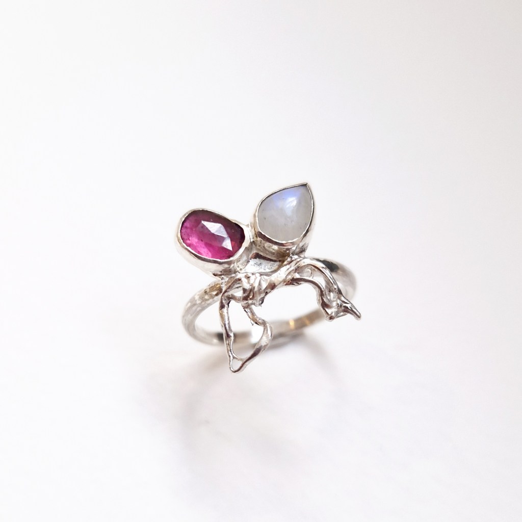 Bague ‘Fais moi fondre’. argent, pierre de lune, tourmaline rose.