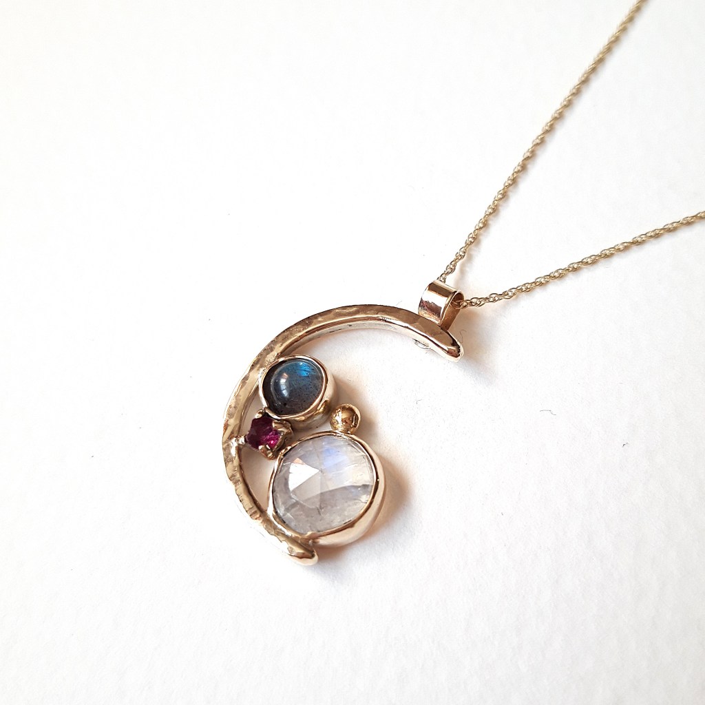 Bague ‘La Muse, le Poete et le Feu’. Or, labradorite, pierre de lune, grenat.
