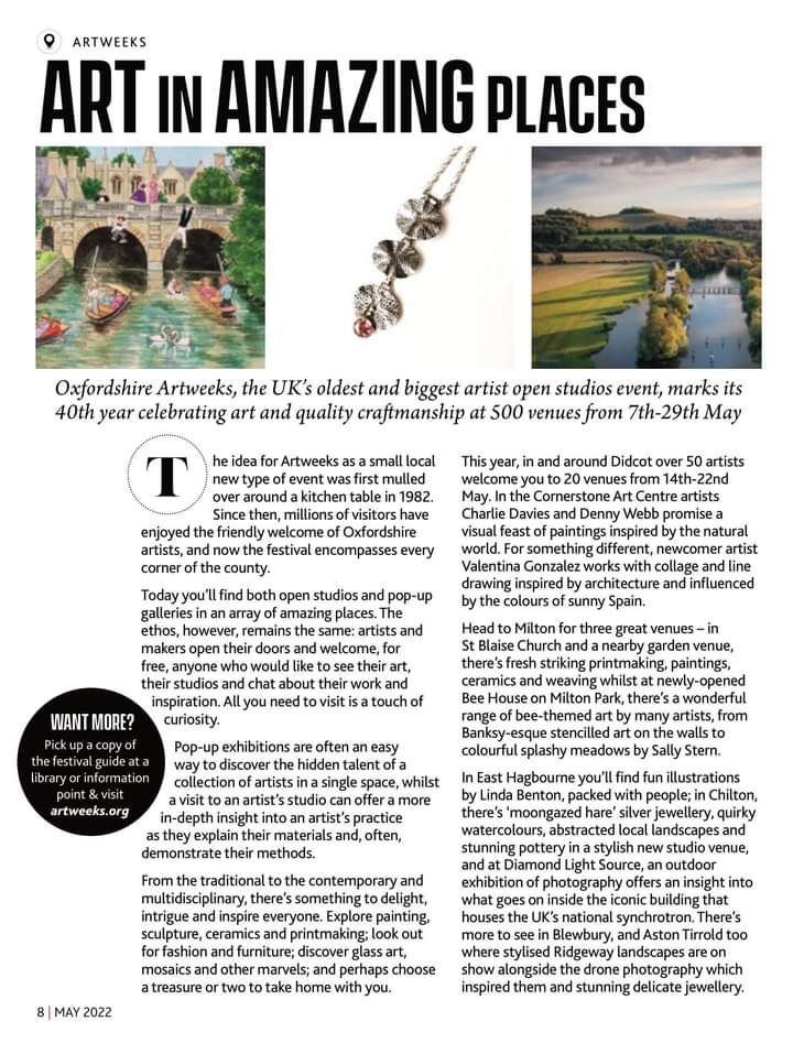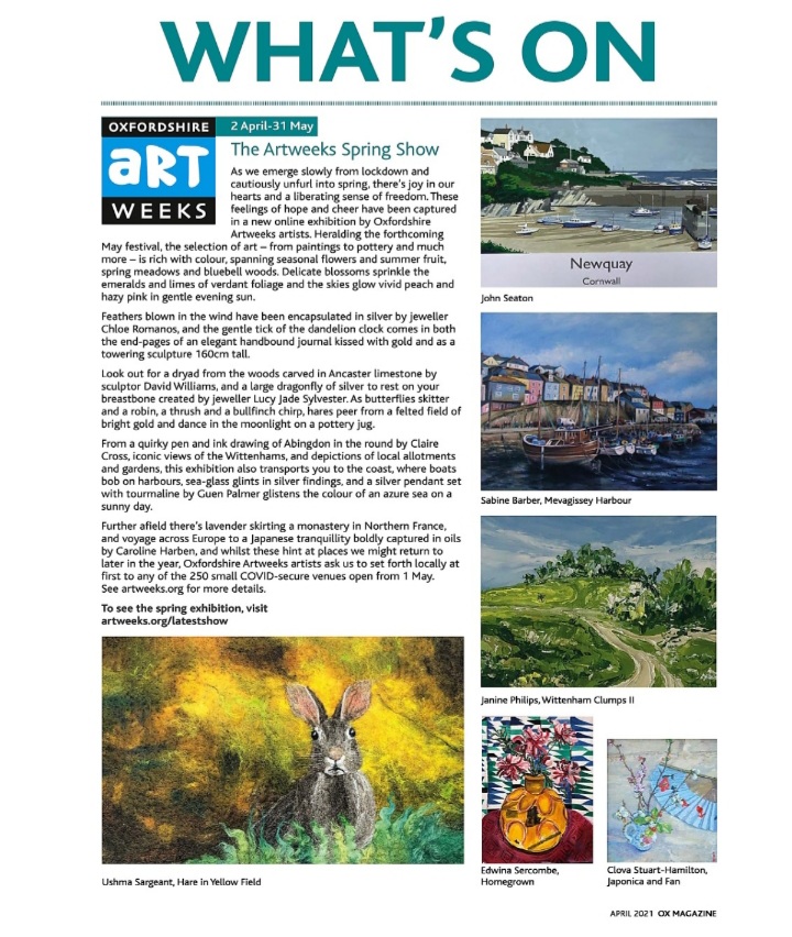 One of my creations and my name are in OX magazine March and April 2021, as part of the Oxfordshire Artweeks Festival event coming up! You can find my online profile here, and details of my up coming exhibitions here: in Oxford (Venue 99) and in Stanford in the Vale (Venue 162).