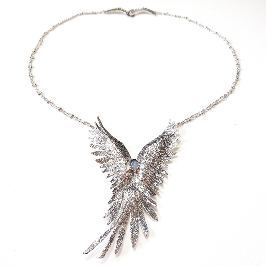 One of my sculptural creations is on exhibition there: The ‘Phoenix-Dove’, a two-sided necklace of a bird made of silver and real dove feathers with added gems, to stand as a strong message of peace and courage to rebuild.