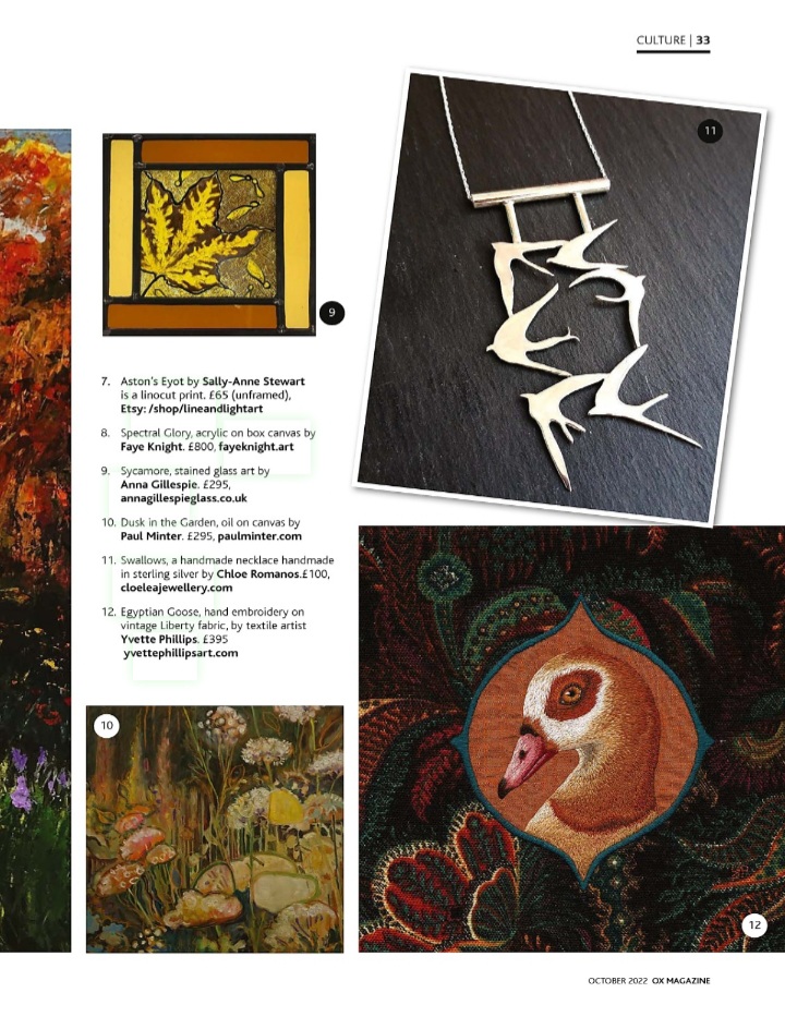 My ‘Swallows’ Necklace is shown in OX Magazine (“A gallery of Autumn through the eyes of Oxfordshire artists”), in the October issue, which has a beautiful cover and lots of articles about poetry!