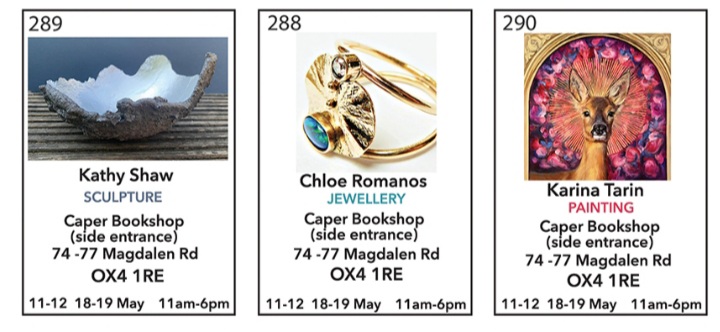 A group of three artists are exhibiting together, as part of Oxfordshire Artweeks, through ‘a magical door’ : goldsmith jeweller Chloe Romanos, painter Karina Tarin and ceramist Lucy Ballard.