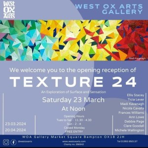 A selection of my work is on display at West OX Arts Gallery for the ‘TEXTURE’ Exhibition. “Great new exhibition of work at the Bampton Gallery. Large abstract paintings, landscapes, wood sculpture, large textile pieces and more! Come along and see work in this beautiful gallery space.”