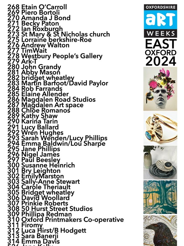- Many exhibiting artists within short walking distance (we’ll have East Oxford Artweeks local trailmaps to hand out if you want one)