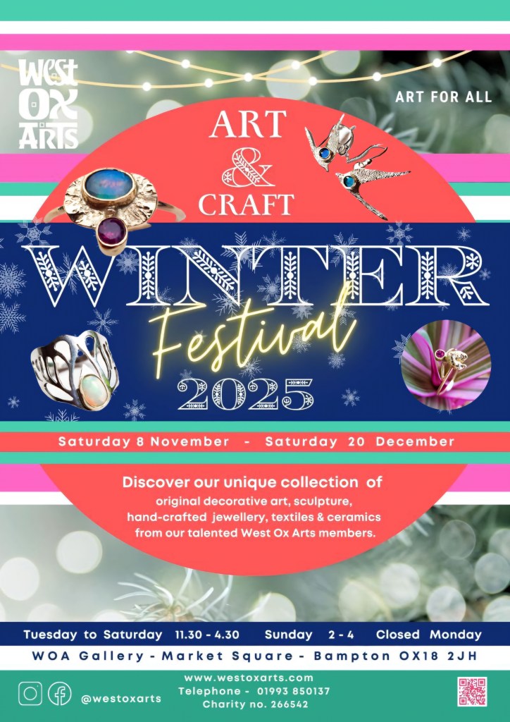 I will be taking part in the Christmas Arts and Crafts show at West Ox Arts in Bampton, Oxfordshire, 16th October to 18th December.